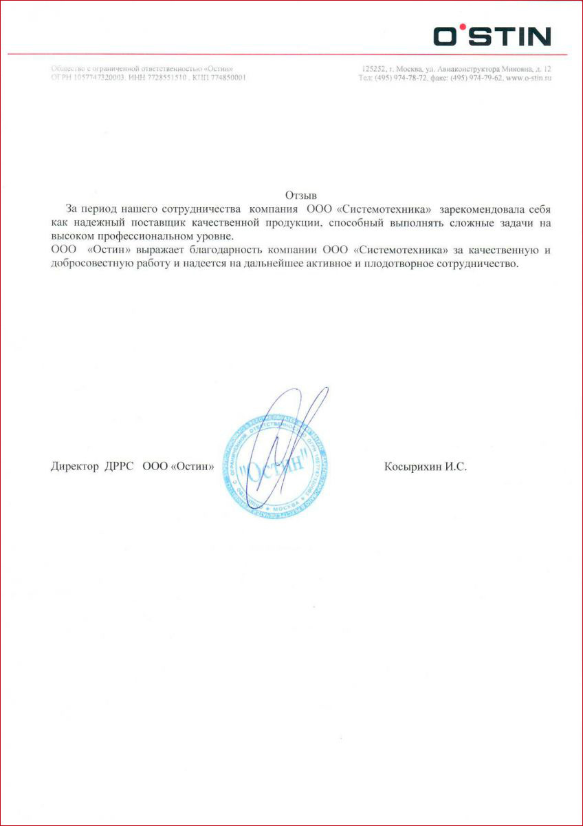 ООО «Остин» выражает благодарность компании ООО «Системотехника» за качественную и добросовестную работу и надеется на дальнейшее активное и плодотворное сотрудничество.